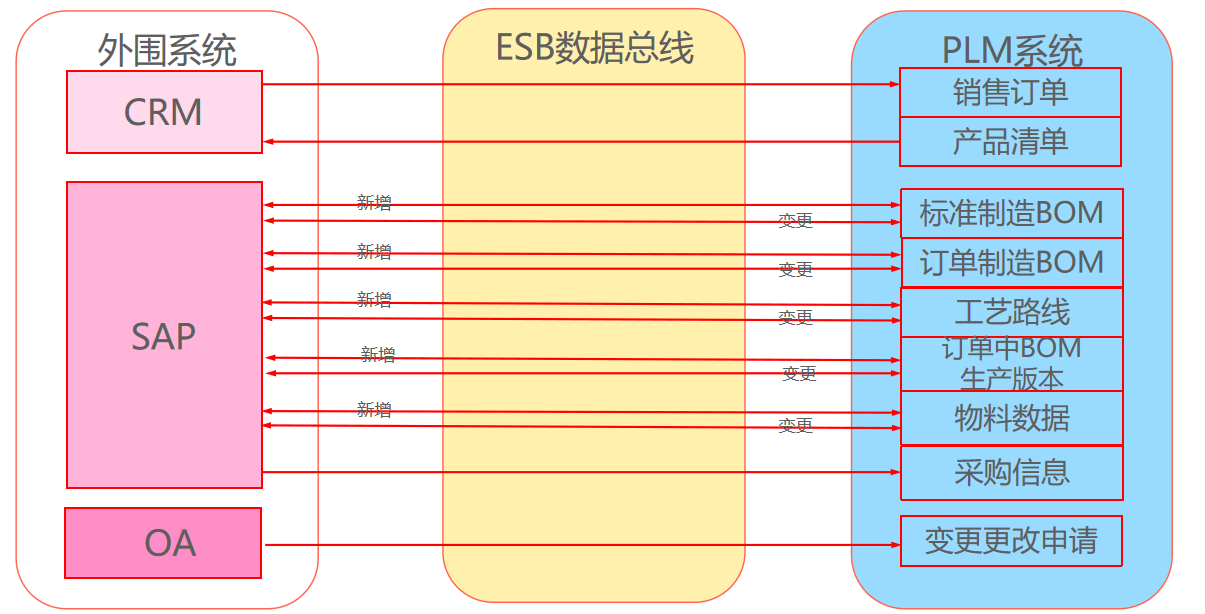 PLM通过ESB数据总线,和外围系统进行数据交互和数据分发
