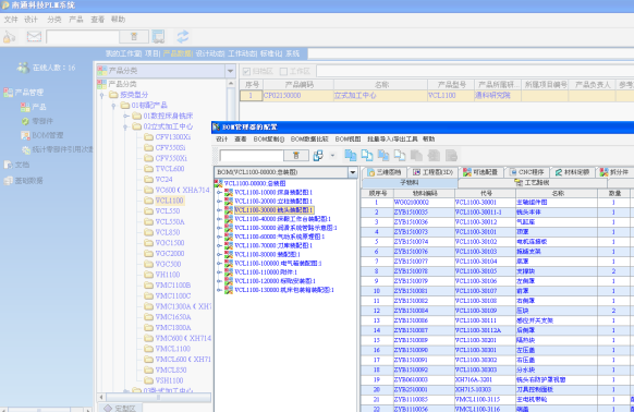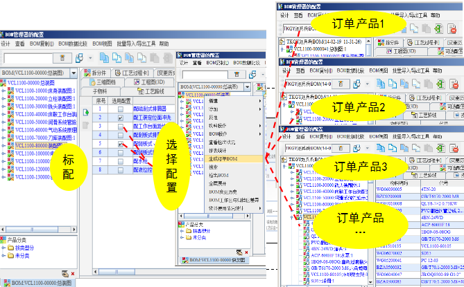 南通科技订单主要为选配件订单设计和少部分完全非标订单设计。选配订单即为在基本型基础上经过可选择零部件的选择及其连带配置完成订单要求的设计。PLM设置了非常方便的可供选配零部件管理和按需选择的设计方式,如下图左边的BOM树为基本型产品结构,中间提供存放供选择配置的零部件库,然后按需勾选选配件后自动生成右边的订单产品结构: