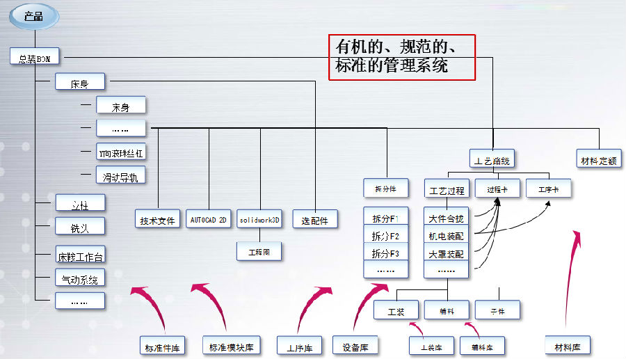 其中基本型产品库建立时,思普咨询师指导南通科技建立起了有机的、规范的、标准的数据管理框架,包括BOM、2D\3D、工艺等全套研发数据管理模型和最优组织方式,如图3。这一块是企业历史数据里最有价值的部分,最应该梳理和标准化,但也是工作量最大的。