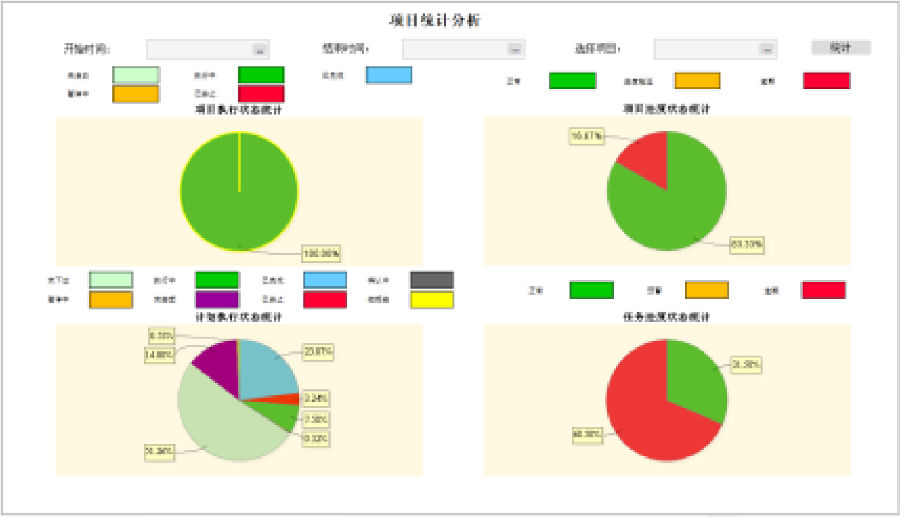 l 项目执行进度,任务执行状态一目了然;可从不同的维度对应相关成果进行统计,为管理改善提供准备的有效数据源。