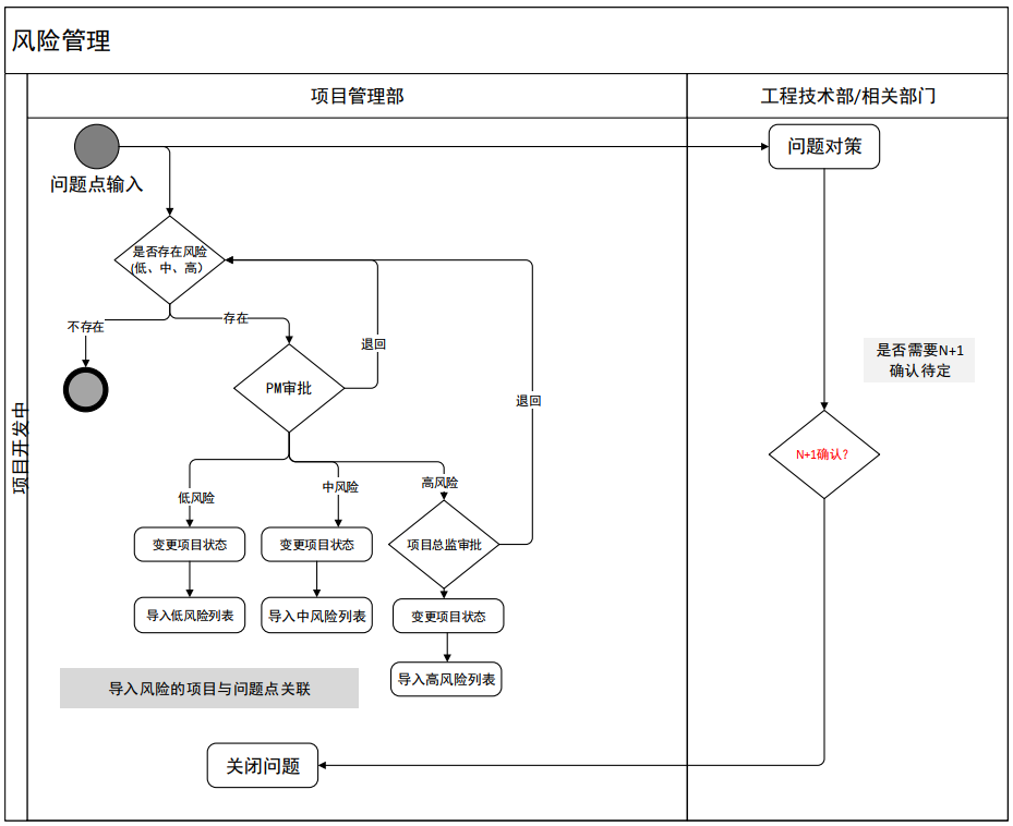 项目成员将项目过程中发生的问题在PLM系统中进行记录,通过流程进行风险评估及问题处理,最终将高、中、低风险的问题导入对应的风险列表当中,同时将项目状态标识为高风险项目,问题处理完成后,将该问题关联对应的项目状态转为低风险项目。