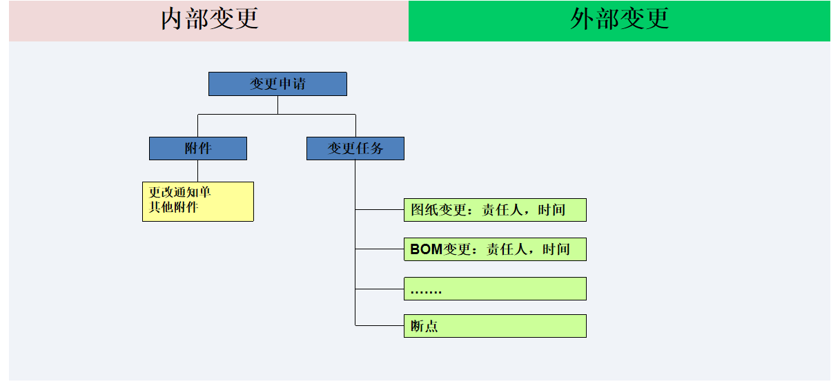 四、项目组初步讨论结论,外部变更的变更申请继续在ERP系统由业务人员进行创建,同步到PLM系统,变更执行部分在PLM系统中进行管控。内部变更申请由变更发起人直接在PLM进行创建,变更执行部分也在PLM系统中进行管控,实现内外部变更的闭环管理。