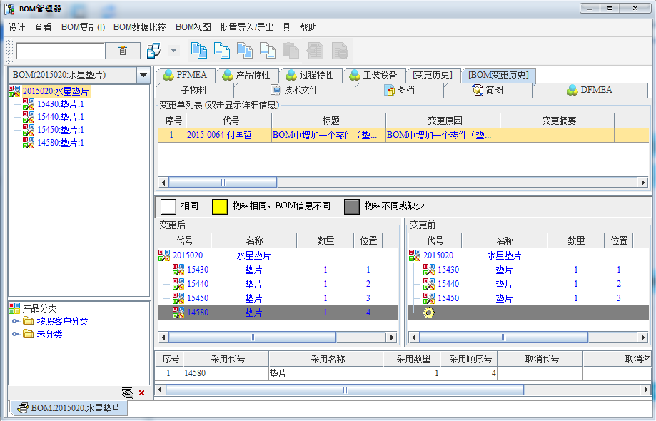 通过变更历史的查看,可以对历次的变更历史进行追溯,而且还可以看到变更前后信息的对比差异,如BOM的前后差异。