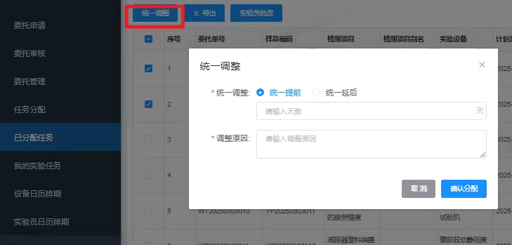 已分配任务实验员批改:针对已分配的任务,系统新增多选后统一修改实验员功能,提高分配人员调整实验员的效率。