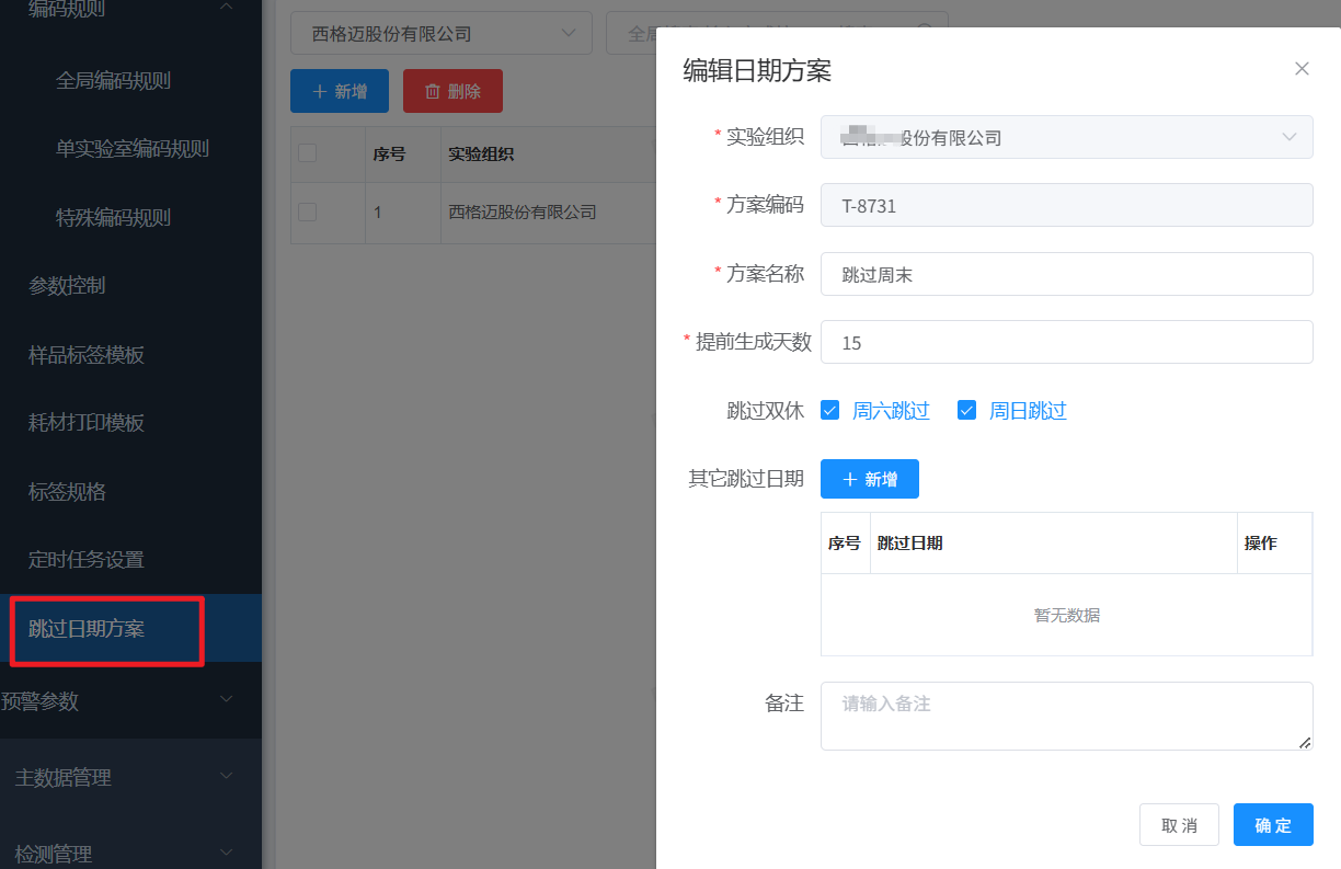 跳过日期方案:针对周末及节假日,新增跳过日期方案功能,点检、保养、校准等自动生成任务功能在设置跳过日期方案后,会根据方案中设置的需跳过时间来生成任务,避免任务生成时实施人员处于周末或假期状态,更加人性化。