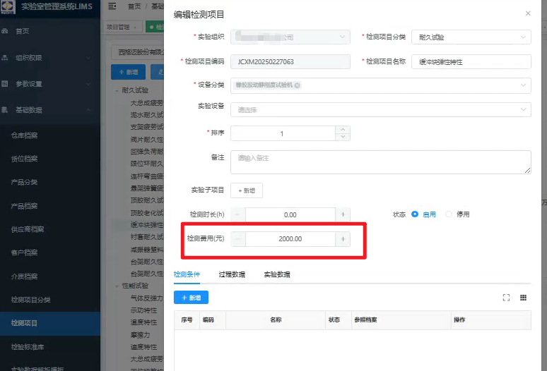 检测费用:检测项目新增试验费用,用于统计实验室外各部门占用实验室资源情况和统计实验员工作绩效。