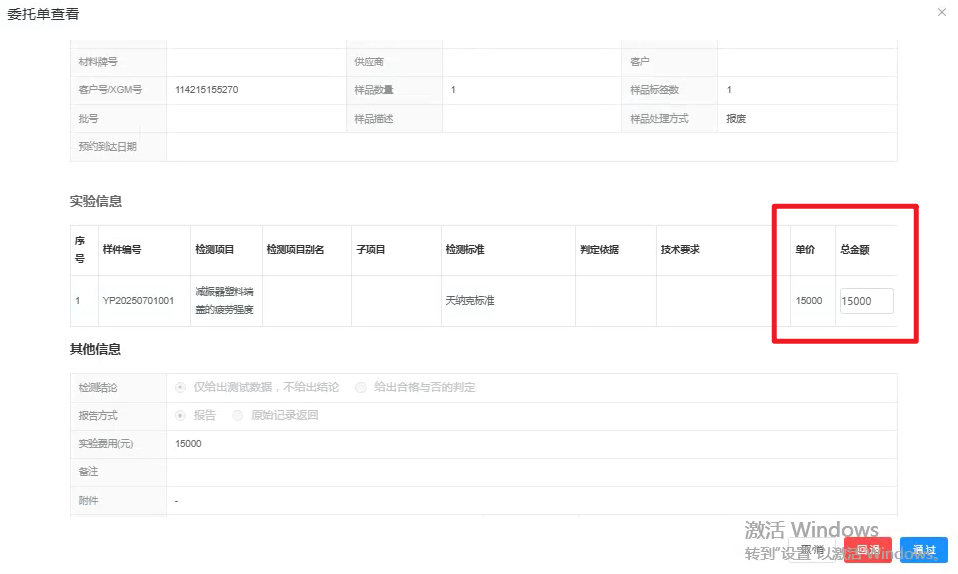 审核修改实验金额:委托审核时支持修改实验金额,部分环境实验支持大批样品同时实验但只收取一次费用,因此不能直接按照单一检测项目金额或样品数乘以检测项目单价进行计算委托费用,增加审核时修改实验金额功能,由实验室委托审核人员视实际情况修改委托金额,避免费用计算单一死板。