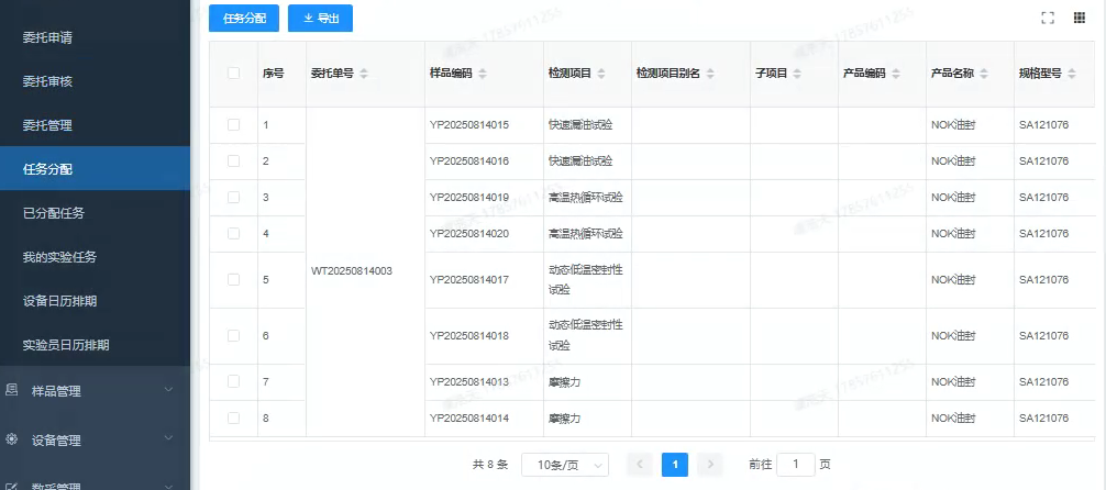 任务分配双重归集:任务分配界面系统不同于之前一条任务一条数据形式,新增自动归集功能,自动按照同一委托单号、同一检测项目两个维度进行归集,便于分配人员分配。