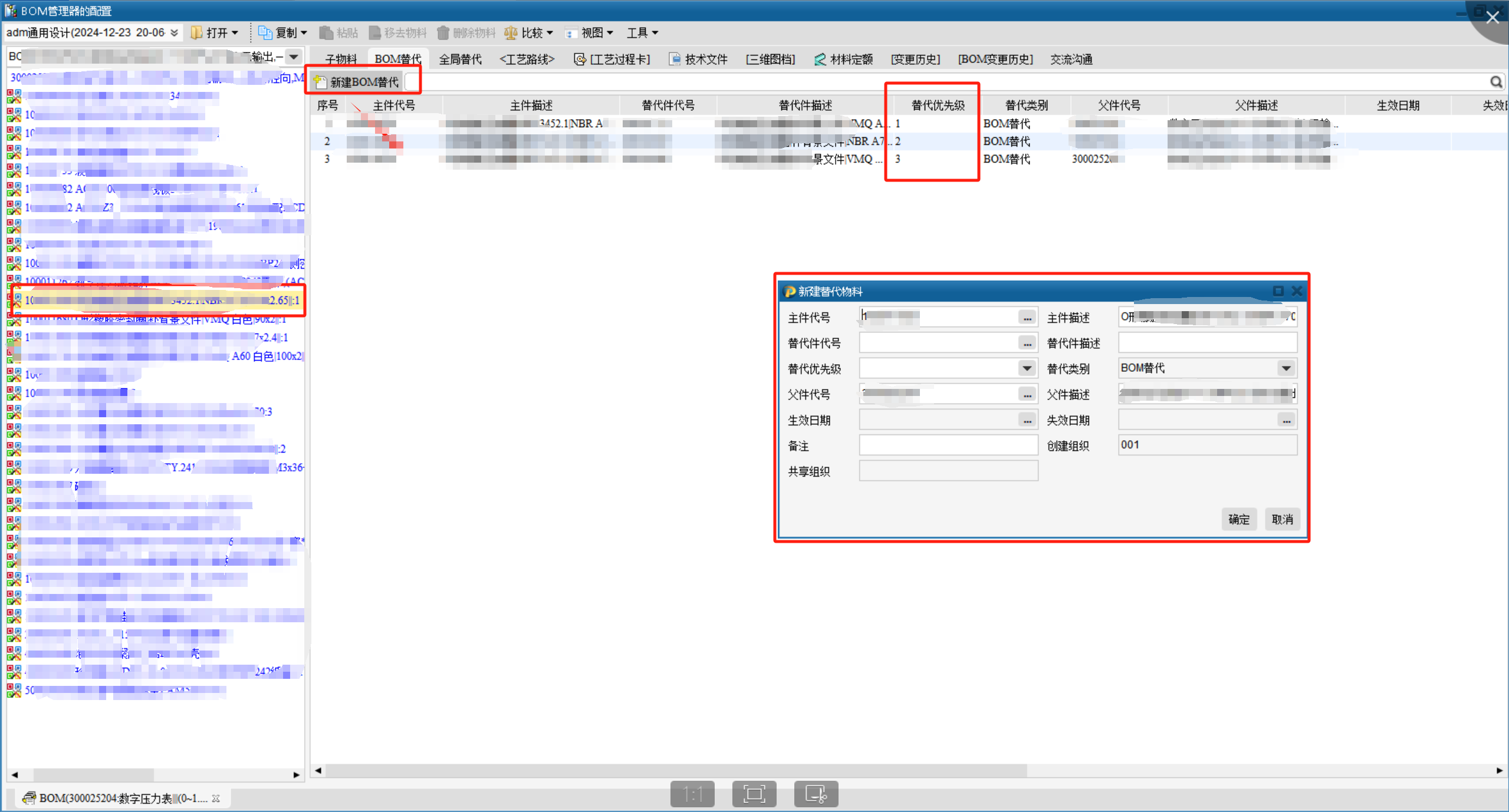 7. 提供替代料台账管理,研发工程师或者工艺工程师在BOM管理器的BOM替代/全局替代里建立替代料的替代关系,计划人员可通过PLM系统查看物料替代料关系并根据优先级选择其合适的替代料,然后在SAP里进行手动修改。