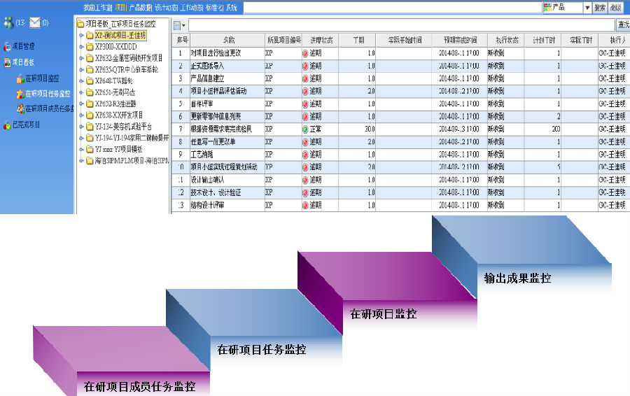 项目立项时,根据种类调用标准模板,并对项目执行进行监控,除了项目本身的状态监控外,思普平台还根据不同管理人群监控需要设立了在研项目监控、领导监控、成员任务监控和项目输出监控等。