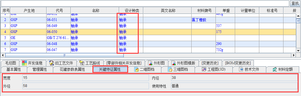 (设计种类为轴承的关键特征属性)