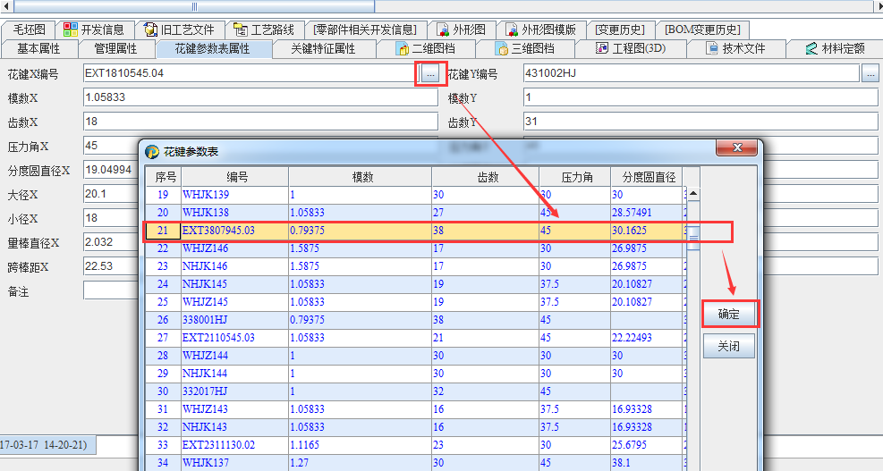 在维护零部件属性时,选取花键参数库,自动将对应的参数值获取到花键参数中: