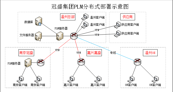 冠盛集团化多地PLM服务分布式部署包括温州总部、温州OE、南京冠盛、嘉兴嘉盛以及多地供应商,如下图所示: