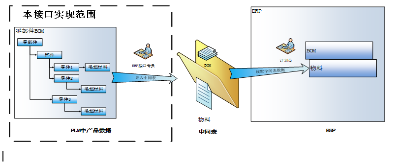 为将PLM中设计数据包括产品BOM、物料信息、工艺路线等传输到ERP系统,双方对传输方案达成一致,依照方案双方进行开发测试,最终完成PLM数据传输至ERP。接口数据的传输通过中间表的方式实现,数据传递的示意图如下图所示: