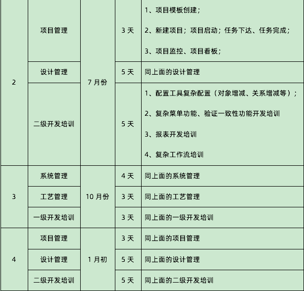 2019年SIPM/PLM售后培训计划安排4次,每三个月组织一次,且分模块进行培训,每次培训3个模块,共分为六个模块,分别是:设计管理、工艺管理、项目管理、系统管理、一级开发培训、二级开发培训;2019年SIPM/PLM售后培训具体安排如下: