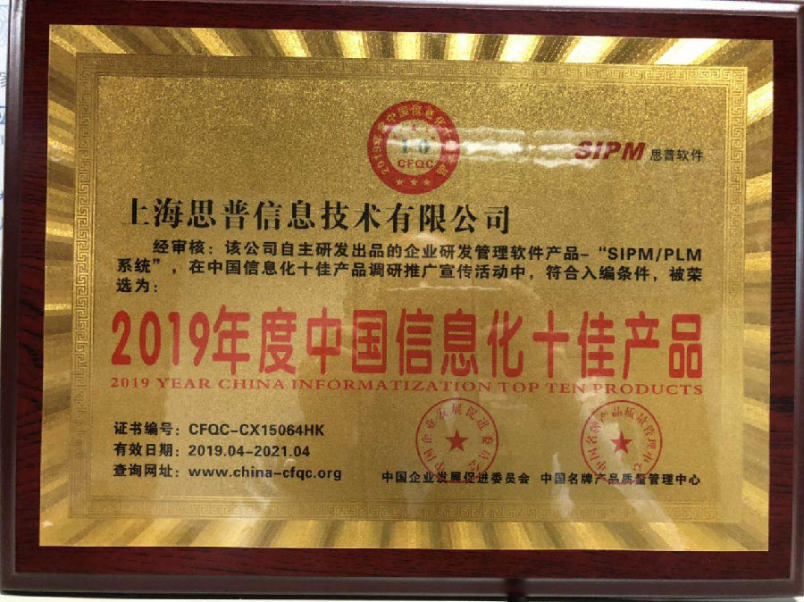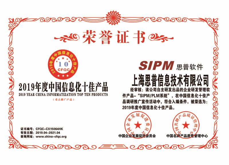2019年4月12日,上海思普信息技术有限公司SIPM/PLM系统获得了由中国企业发展促进委员会与中国名牌产品质量管理中心联合颁发的“2019年度中国信息化十佳产品”荣誉,这也标志着SIPM/PLM系统受到了行业认可。