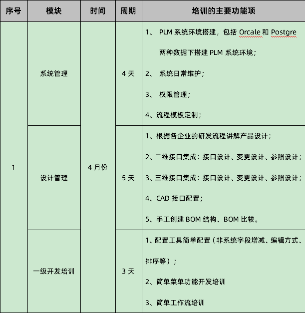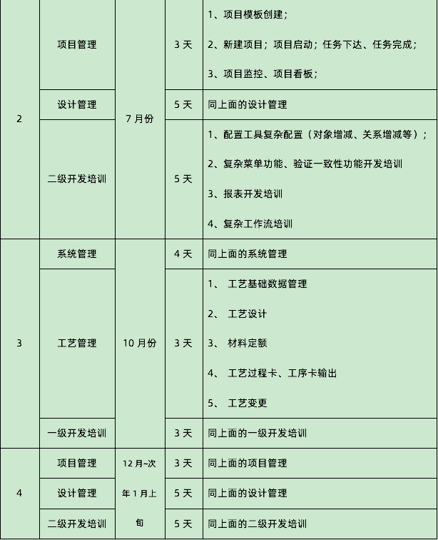 2020年SIPM/PLM售后培训计划安排4次,每三个月组织一次,且分模块进行培训,每次培训3个模块,共分为六个模块,分别是:设计管理、工艺管理、项目管理、系统管理、一级开发培训、二级开发培训;2020年SIPM/PLM售后培训具体安排如下: