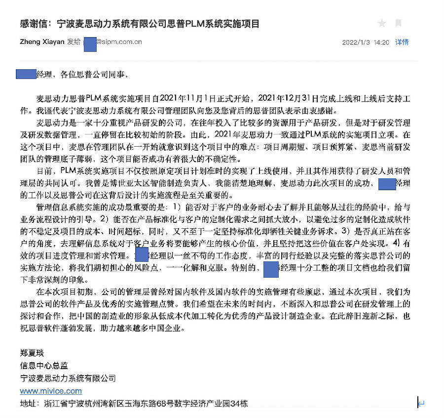 2021年11月1日--12月31日期间,思普软件对麦思动力思普PLM系统实施项目提供了大力支持和帮助,项目得以顺利完成上线。宁波麦思动力系统有限公司特此发来感谢信,感谢思普软件项目经理以及思普各部门团队对相关工作的支持。