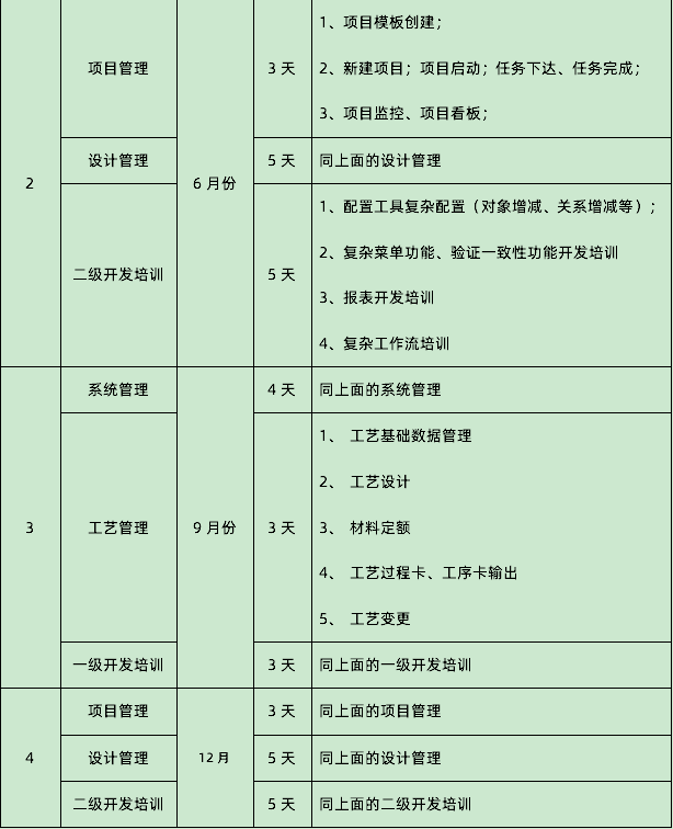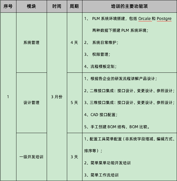 2022年SIPM/PLM售后培训计划安排四次,每三个月组织一次,分别是3月、6月、9月、12月,且分模块进行培训,每次培训3个模块,共分为六个模块,分别是:设计管理、工艺管理、项目管理、系统管理、一级开发培训、二级开发培训;2022年SIPM/PLM售后培训具体安排如下: