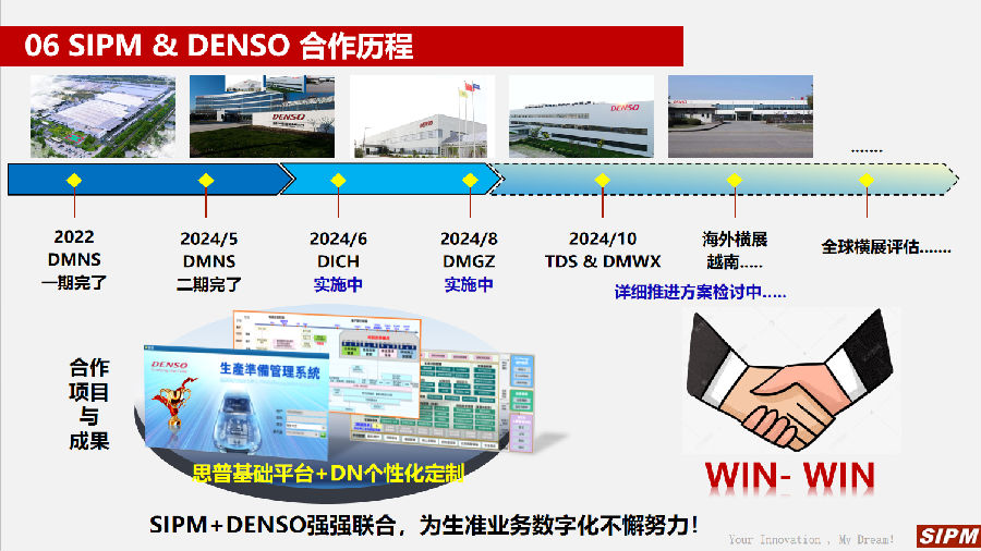 电装(DENSO)作为全球汽车零部件及系统领导供应商三强之一,以“环保”和“安全”为己任,以传递“关爱”和“喜悦”为使命,通过提供安全、环保的汽车零部件产品,致力于实现“人・车和谐共存”的汽车社会。思普与电装的合作,始于2022年与南沙电装(DMNS)的生准数字化平台建设。