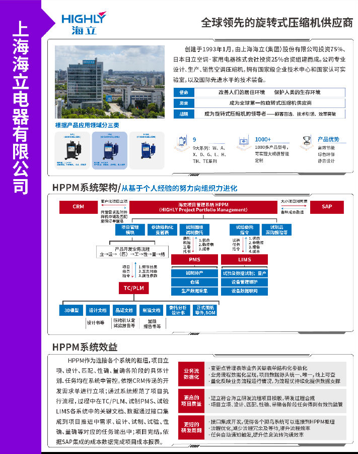 上海海立电器有限公司是全球领先的制冷压缩机供应商,利用SIPM/PLM,建设研发项目管理平台HPPM,实现了研发和订单快速打样的全面管理,全面集成KOA、CRM、LIMS、PMS(样品制造)、TeamCenter系统,成为海立电器数字化企业的中枢系统。通过使用iSIPM云平台,自主实现HPPM和研发管理同步改善,是国有控股企业成功应用SIPM/PLM项目管理模块的杰出代表。