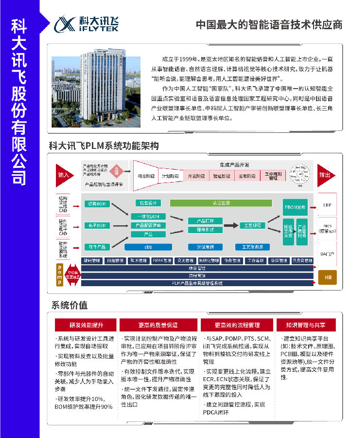 科大讯飞股份有限公司是国际知名的智能语音和人工智能上市企业,其产品在全球范围内广受欢迎,技术水平始终保持国际前沿。科大讯飞利用SIPM/PLM系统,实现IPD+APQP研发流程,机械、电子、软件、包装数据的一体化有机管控,极大地丰富和深化了SIPM/PLM高科技电子行业解决方案,在高科技消费电子行业具有显著的引领示范效应。实现了基于多个国际监管规定的物料合规性申请、合法判断与应用合规的全链条管控,对TO C领域的大型制造业企业具有极强的示范意义。