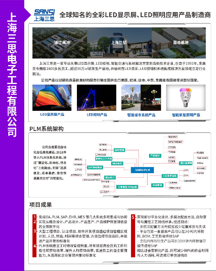 上海三思电子工程有限公司是全球领先的LED室外大屏和专业照明供应商,通过SIPM/PLM实现研发模块化和工程订单配置化,在SIPM/PLM标准模块化配置的基础上,创造性实现小平台配置,工程项目开发工作量节省达80%。长期坚持使用iSIPM云平台,自主坚持研发管理改善和PLM系统开发实现同步开发,全面管理研究院所有业务,实现研究院所有员工的绩效管理自动化,在与思普软件长期合作过程中,毫无保留接待思普软件客户学习与交流,为提升众多客户的研发管理水平做出了杰出贡献!
