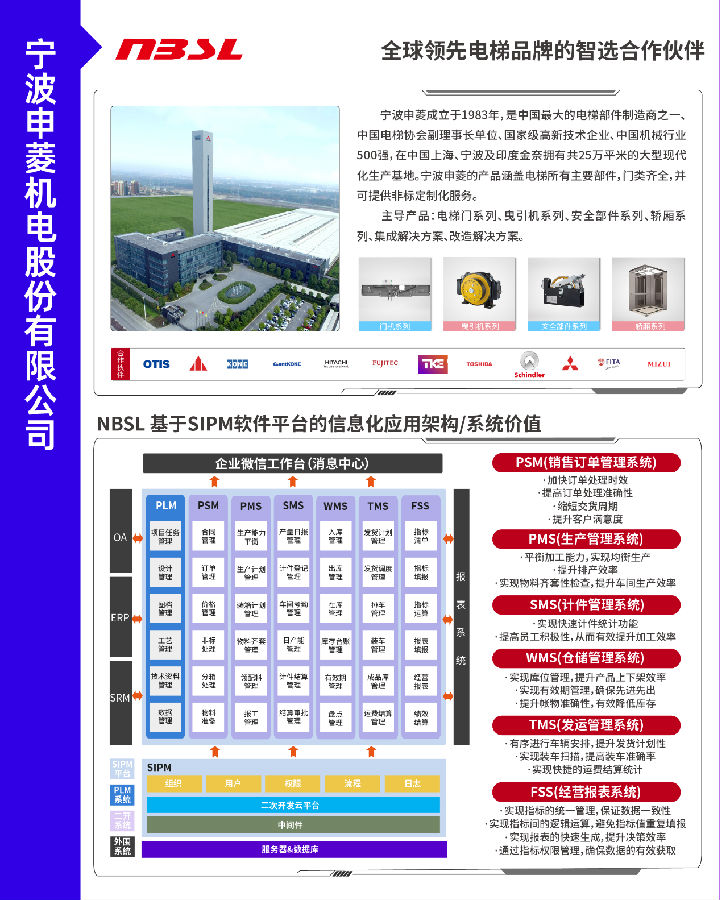 宁波申菱机电股份有限公司是全球领先电梯品牌的智选合作伙伴,通过与思普软件合作开发,在SIPM/PLM基础上实现了三菱电梯设计规范的图纸设计、BOM解算、配方解算,实现了模块化配置和参数化设计的完美结合,为SAP系统提供精准的BOM数据。通过使用iSIPM云平台,以SIPM/PLM底层平台,自主开发了销售订单管理系统PSM、生产管理系统PMS、计件管理系统SMS、仓储管理系统WMS、发运管理系统TMS、经营报表系统FSS,成为思普软件客户自主二次开发的杰出代表。