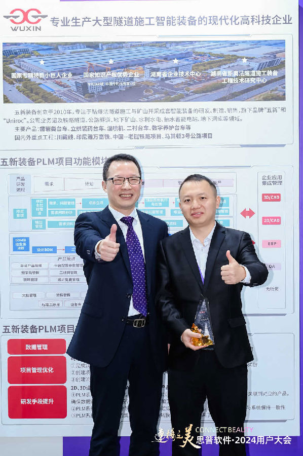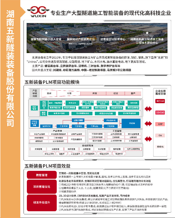 湖南五新隧道智能装备股份有限公司专业生产大型隧道施工智能装备的现代化高科技企业,其产品服务于铁路、公路隧道、地下矿山等多个领域,并在国内外4000多个项目中得到应用。五新装备通过SIPM/PLM系统,按照IPD思想及质量体系要求,实现研发技术文件的三级校审质量管控,实现流程透明、数据可溯,确保了项目研发、制造与交付的全面落地支撑。SIPM/PLM作为五新装备信息化系统建设中的桥梁,实现了公司前后端业务、系统整合中的数据与流程的贯通,消除了信息孤岛,该项目的成功应用,是国之重器行业实现自主研发与管理的典范。