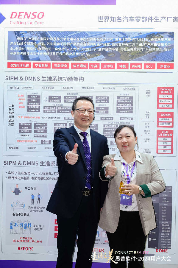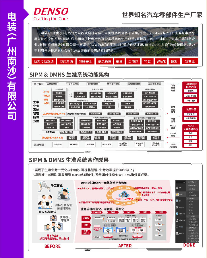 电装是世界知名汽车零部件生产厂家三甲之一,致力于打造:人与设备·信息化共存的柔性工场,产品品类众多,覆盖领域广。为实现“确保电装永远是受世界各地人们信赖的公司”这一企业理念,南沙电装通过SIPM/PLM系统对生准业务管理面进行了全面改善,并以中国地域为中心,向全球横展。通过本次项目,实现了生准业务一元化、标准化、可视化管理,取得了业务效率提升30%以上、项目推进0遗漏 、事前预警100%、系统运维信息安全100%确保等成果。树立了汽车零部件全球化制造基地生准业务数字化的标杆。