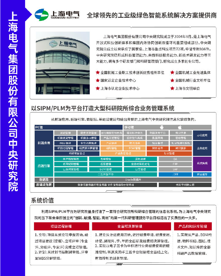 上海电气集团股份有限公司中央研究院是上海电气集团的科技创新体系核心,多年来,在智慧能源、智能制造、数字化技术、医疗康复机器人、环保等多领域不断取得突破与创新,目前已承担国家及上海市重点科技项目70余项,申请专利300余项。中央研究院利用SIPM/PLM平台打造了一套符合研究院所科研综合管理的信息化系统,全面实现资金流、信息流和项目流的一体化管理,为上海电气中央研究院的当下和未来所创立的“创新、敏捷、智能、高效”的新一代科研管理服务平台目标迈出了实质性的一大步。本项目成功实施对大型集团化企业中央研究院的运行模式创新树立了标杆。