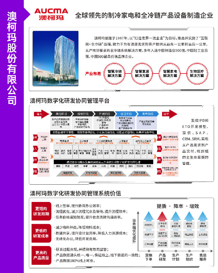 澳柯玛股份有限公司创建于1987年,是中国500最具价值品牌,中国制造业500强企业、中国轻工业百强企业。为推动技术创新于2022年牵手思普,建设集团级数字化研发协同管理平台,全面支撑各业务板块的产品研发工作,全面替换国外著名PLM系统,并实现和各管理系统高效集成。切实实现增效、提质、降本的持续改善,为澳柯玛数字化转型奠定坚实基础。系统应用深入效果显著,成为行业标杆项目,澳柯玛没有最好只有更好。