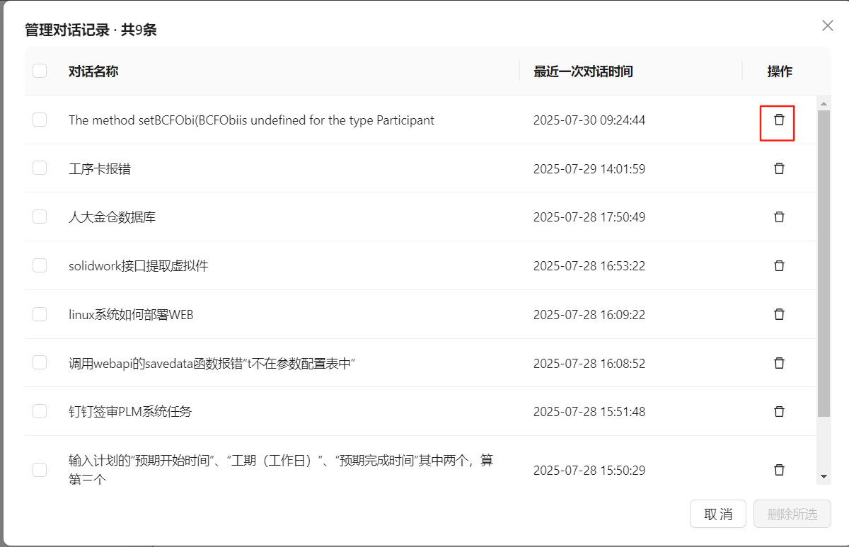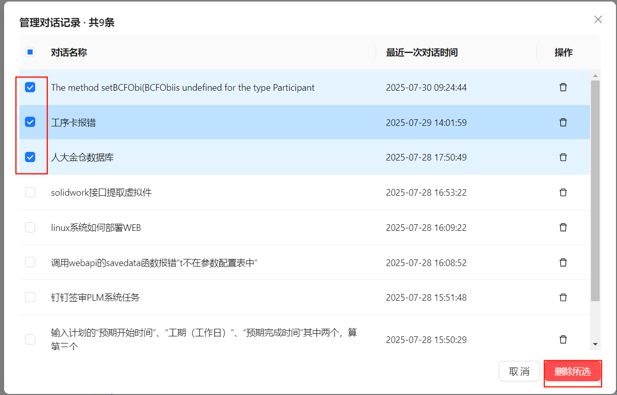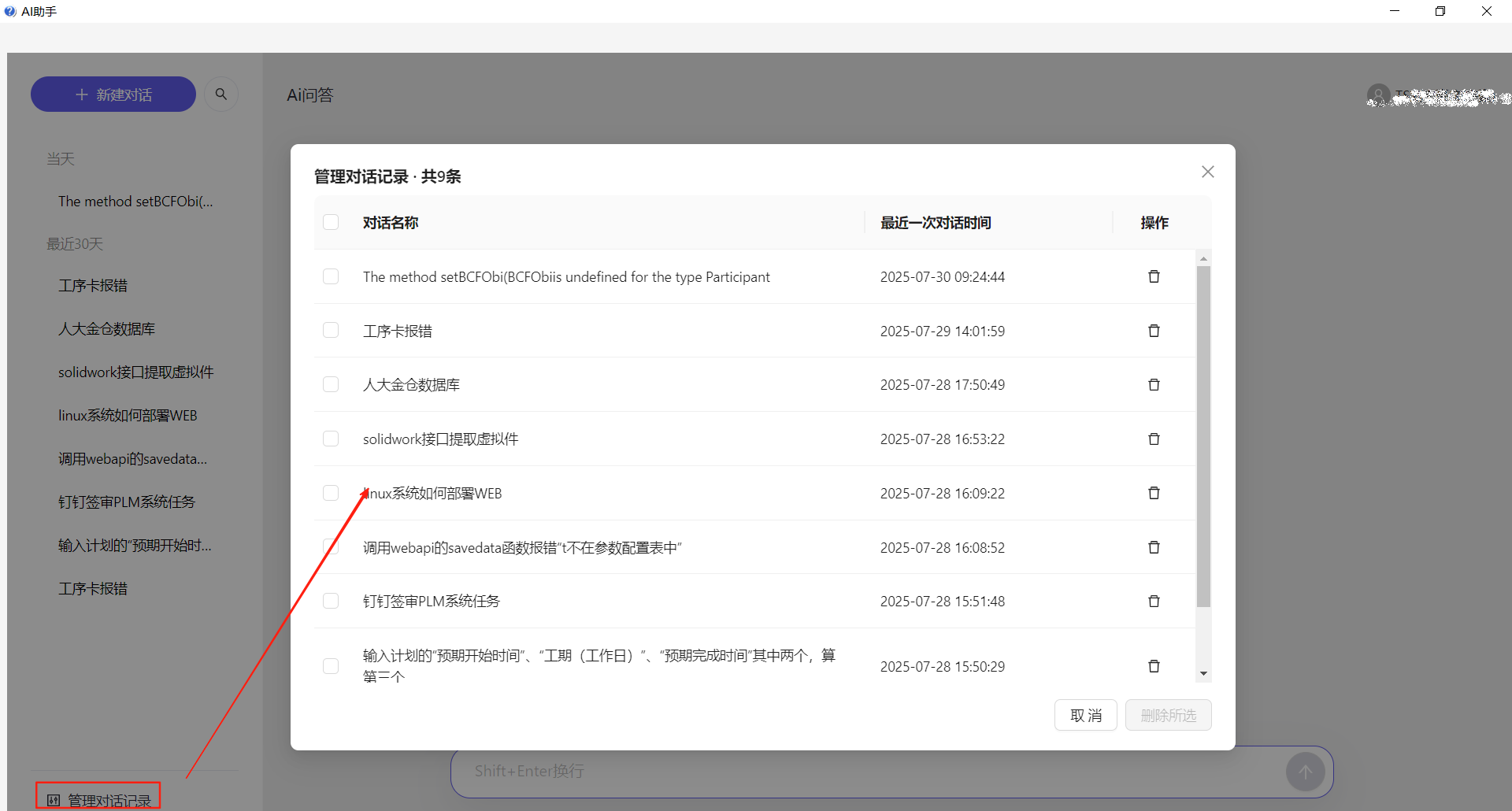 勾选对话记录,点击删除所选,删除多条记录